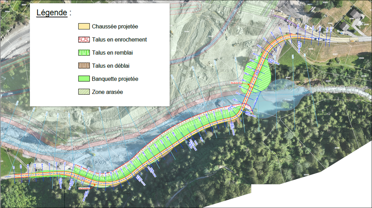 - De décembre 2025 à avril 2026 : Les endiguements en amont de la galerie de la rive gauche (définitif) et de la rive droite (provisoire) du torrent du Fregnoley sont érigés.