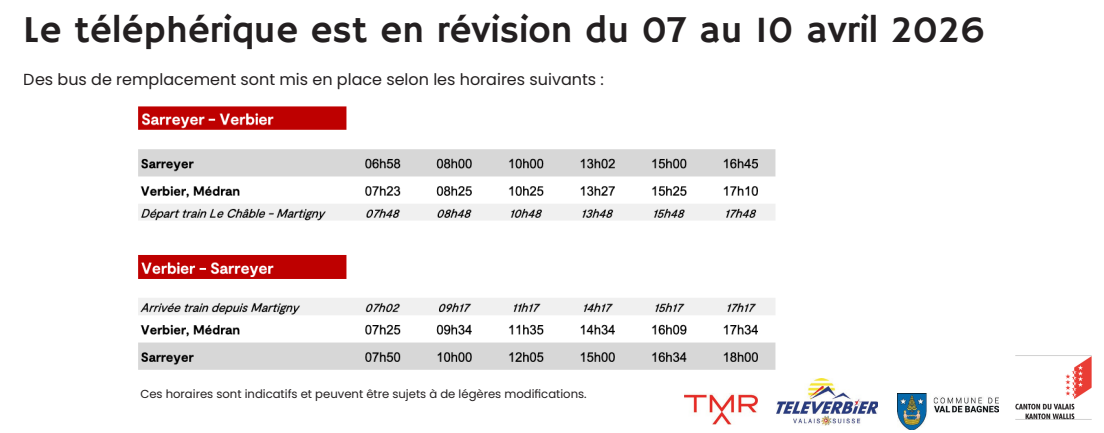 TMR assurera la liaison en bus avec Verbier selon les horaires annexés. Les dates coïncidant avec les vacances scolaires, les transports des écoliers ne seront pas impactés.